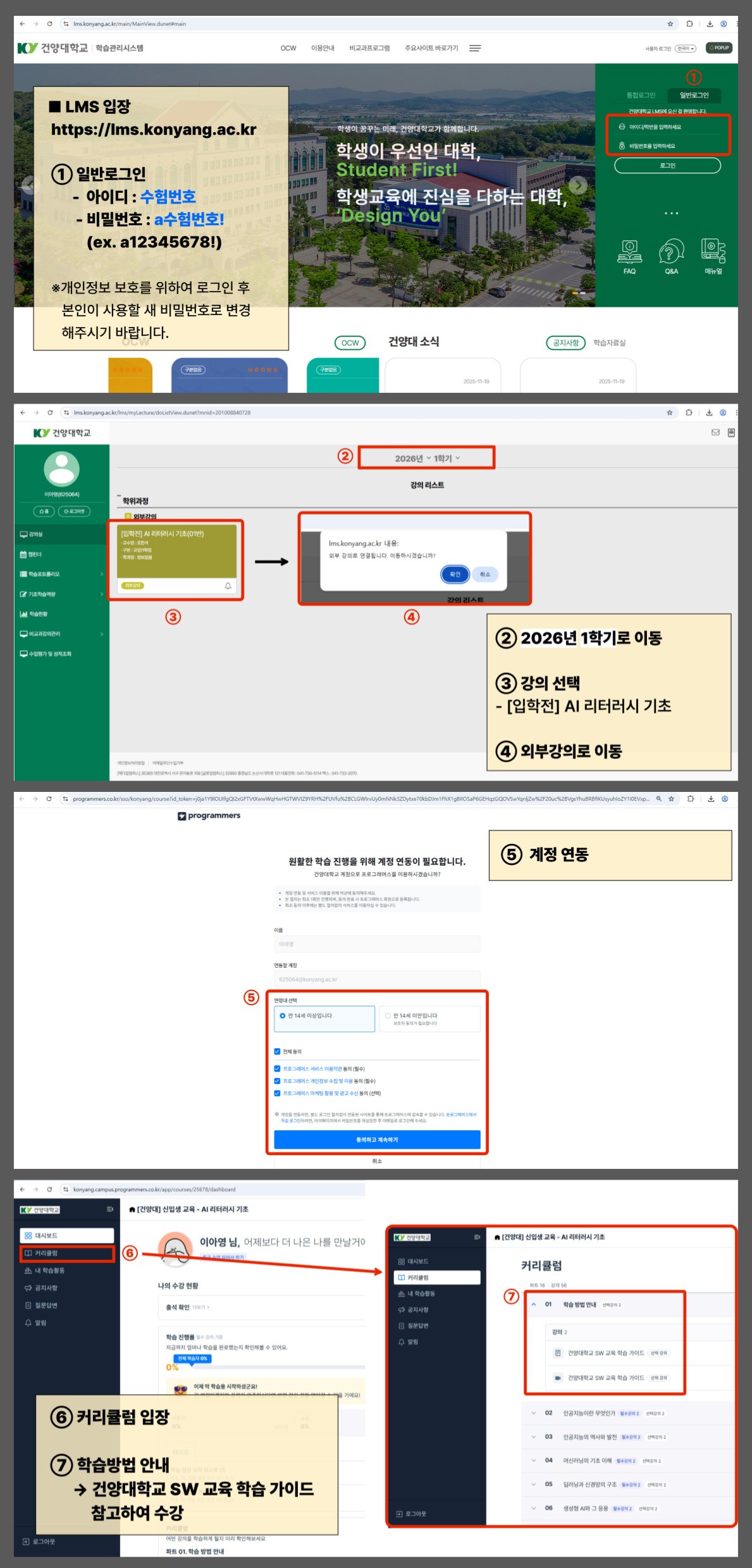 ※ 아이디 : 수험번호 / 비밀번호 : a수험번호! (ex. a12345678!) ※ 해당 LMS 아이디는 수강기간 동안만 사용되며, 입학 후 학번에 의하여 재생성됩니다. ※ LMS 로그인 후 비밀번호 반드시 변경 필수