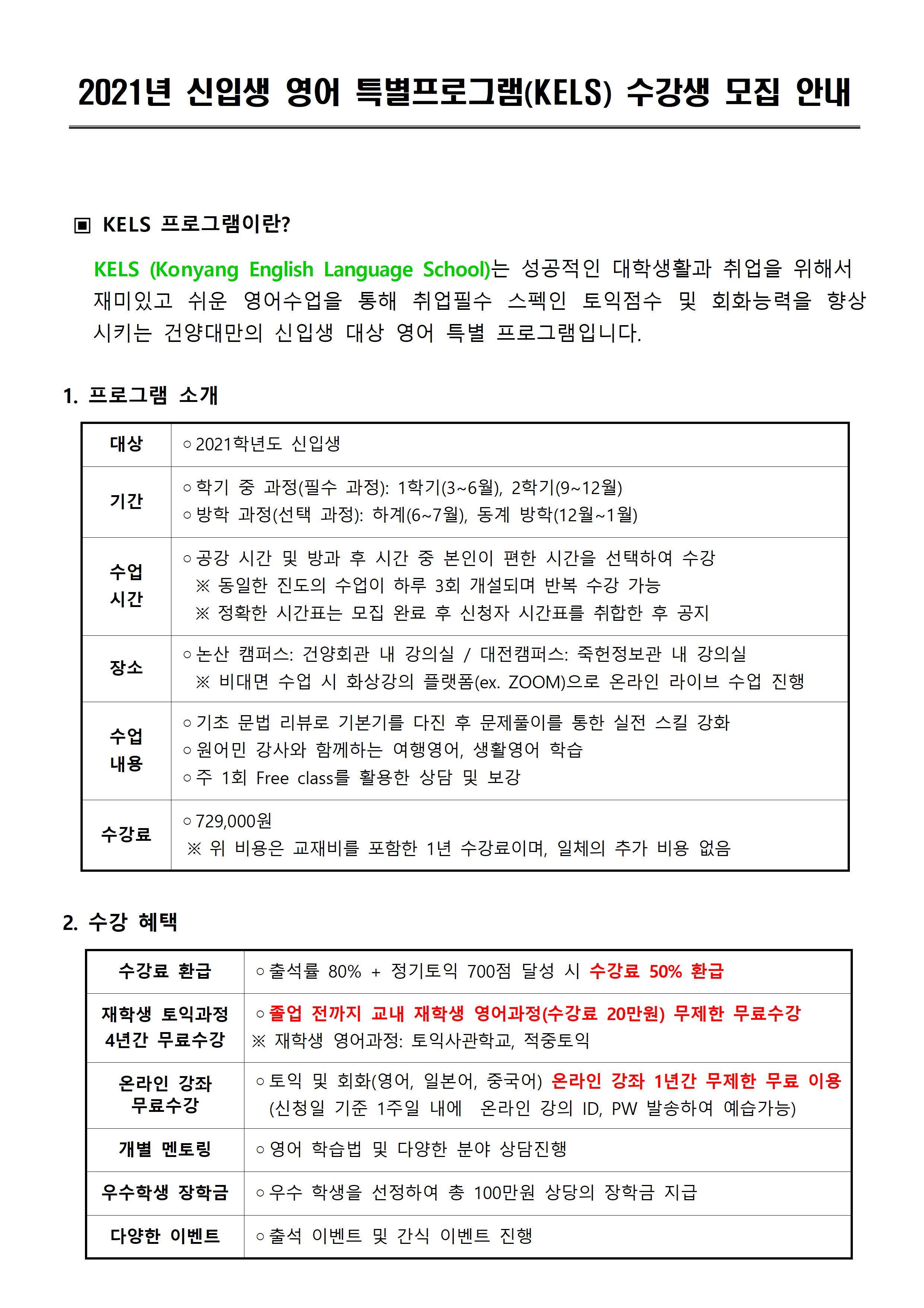 | 제목 | 2021년 신입생 영어 특별프로그램(KELS) 수강생 모집안내 | ||||