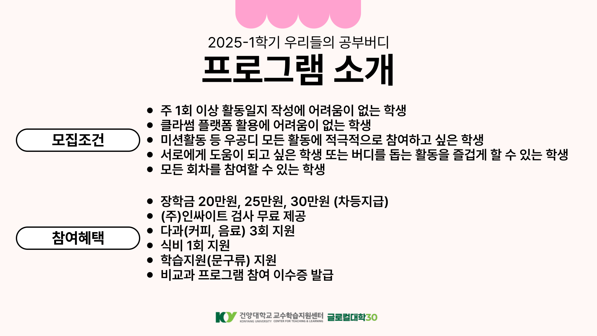 | 제목 | 2025-1학기 우리들의 공부 버디(우공디) 그룹 모집 안내 | ||||