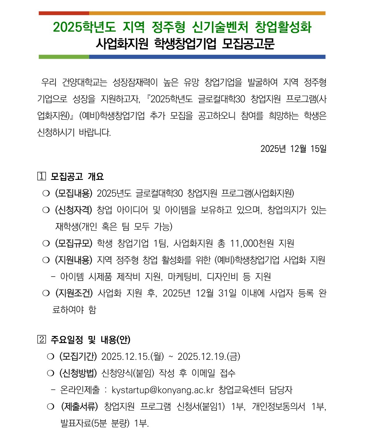 | 제목 | 2025학년도 지역 정주형 신기술벤처 창업활성화 사업화지원 학생창업기업 추가 모집 공고 | ||||