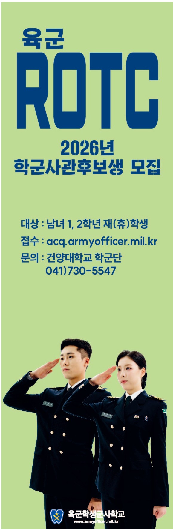 대상 : 남녀 1, 2학년 재(휴)학생 접수 : http://acq.armyofficer.mil.kr/ 문의 : 건양대학교 학군단 041-730-5547